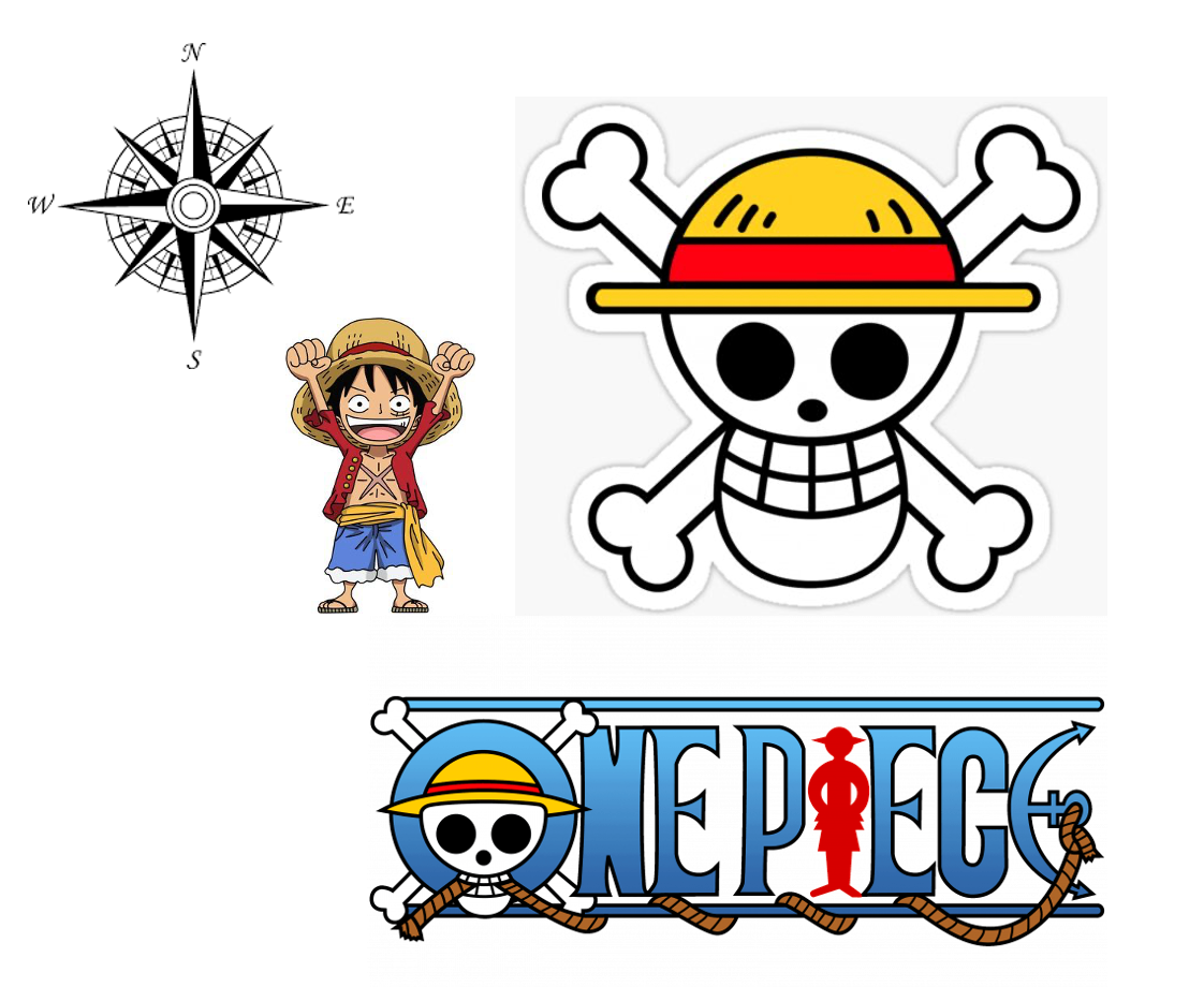 one piece compass and boy 2 inch height each, skull and crossbones 4 inch width, 3.5 inch height and one piece logo 5 inch width