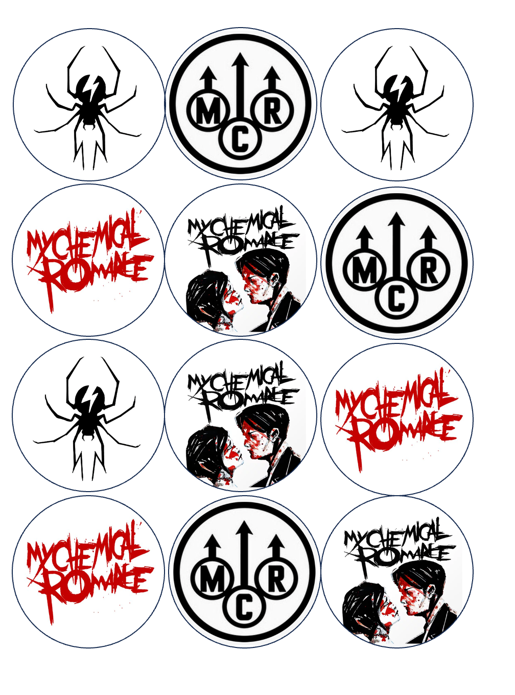 Set of 12 "my chemical romance" pre cut edible image discs for desserts, drink toppers, choose your size