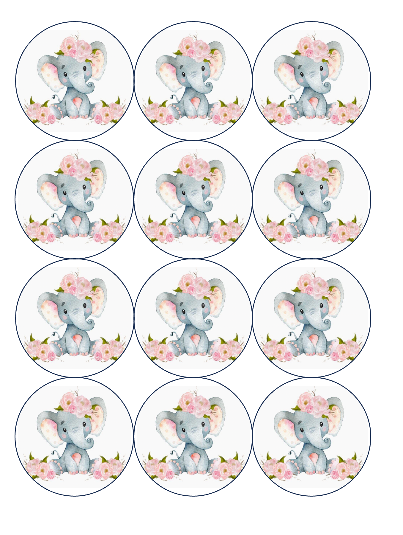 Set of 12 "baby elephant" pre cut edible image discs for desserts, drink toppers, choose your size