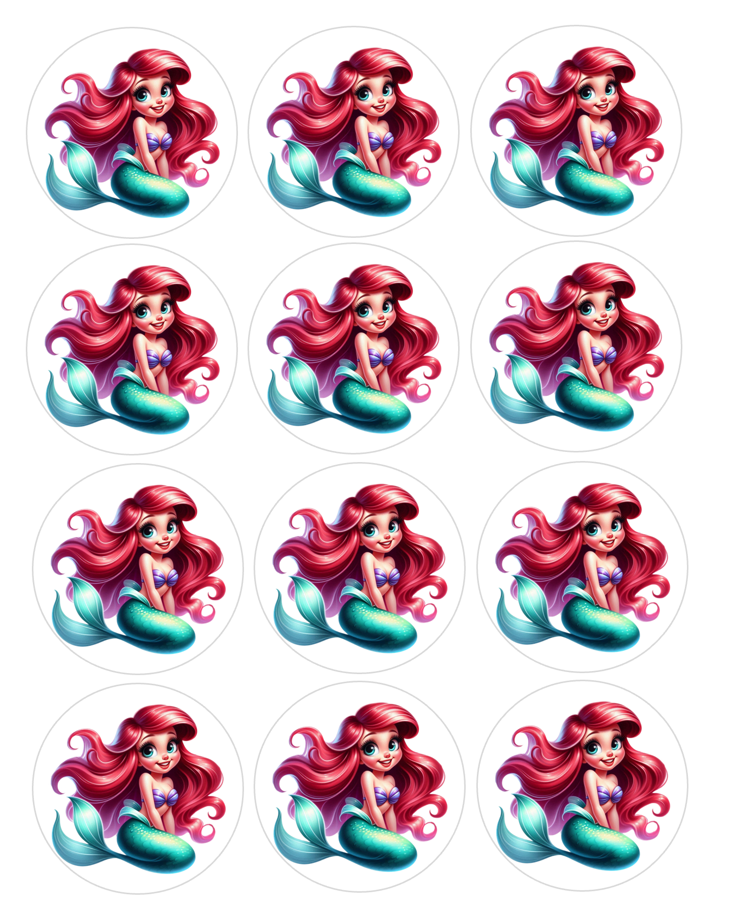 Set of 12 Ariel, Little Mermaid pre cut edible image discs for desserts, choose your size