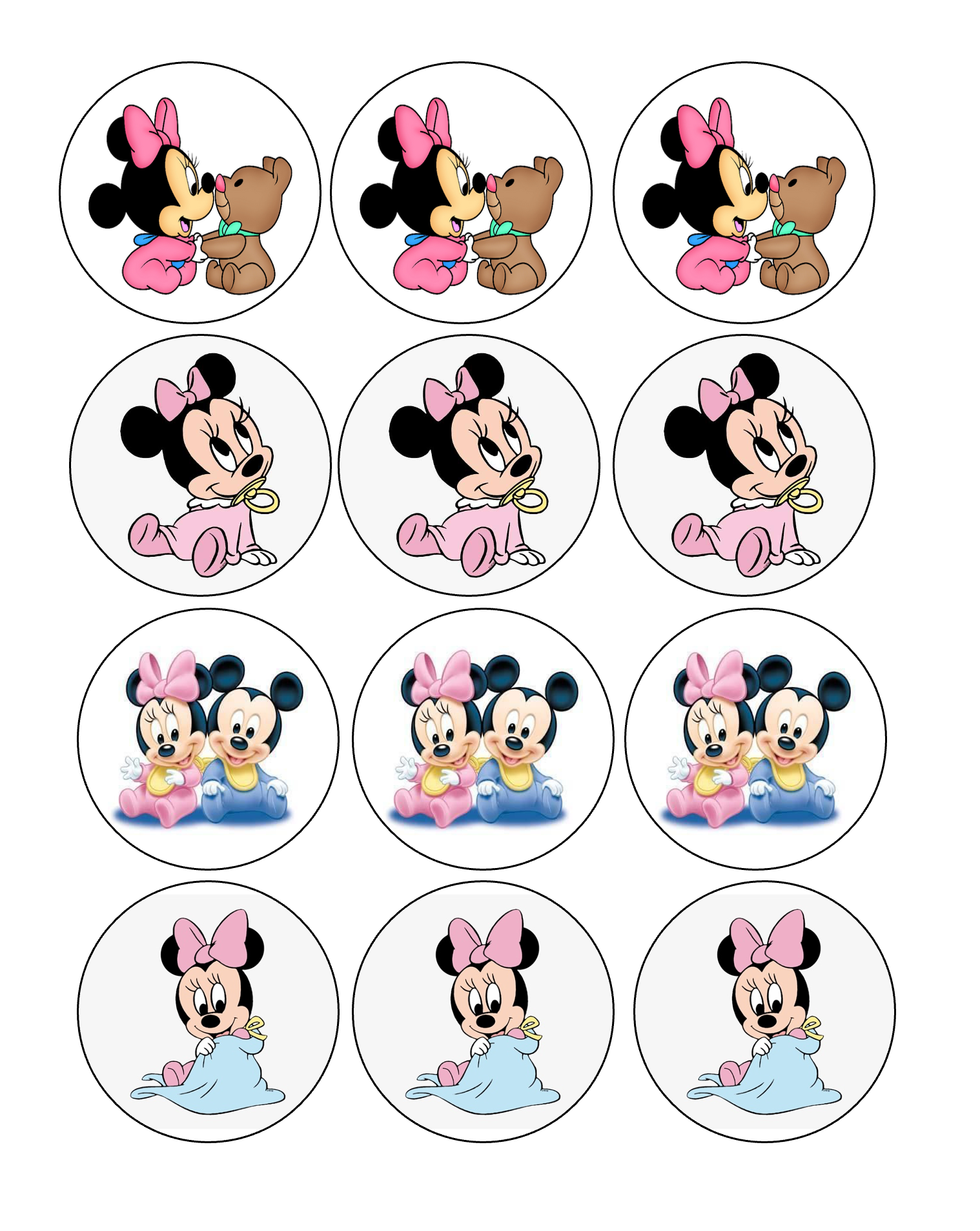 Set of 12 "Baby Minnie and Mickey" pre cut edible image discs for desserts, drink toppers, choose your size
