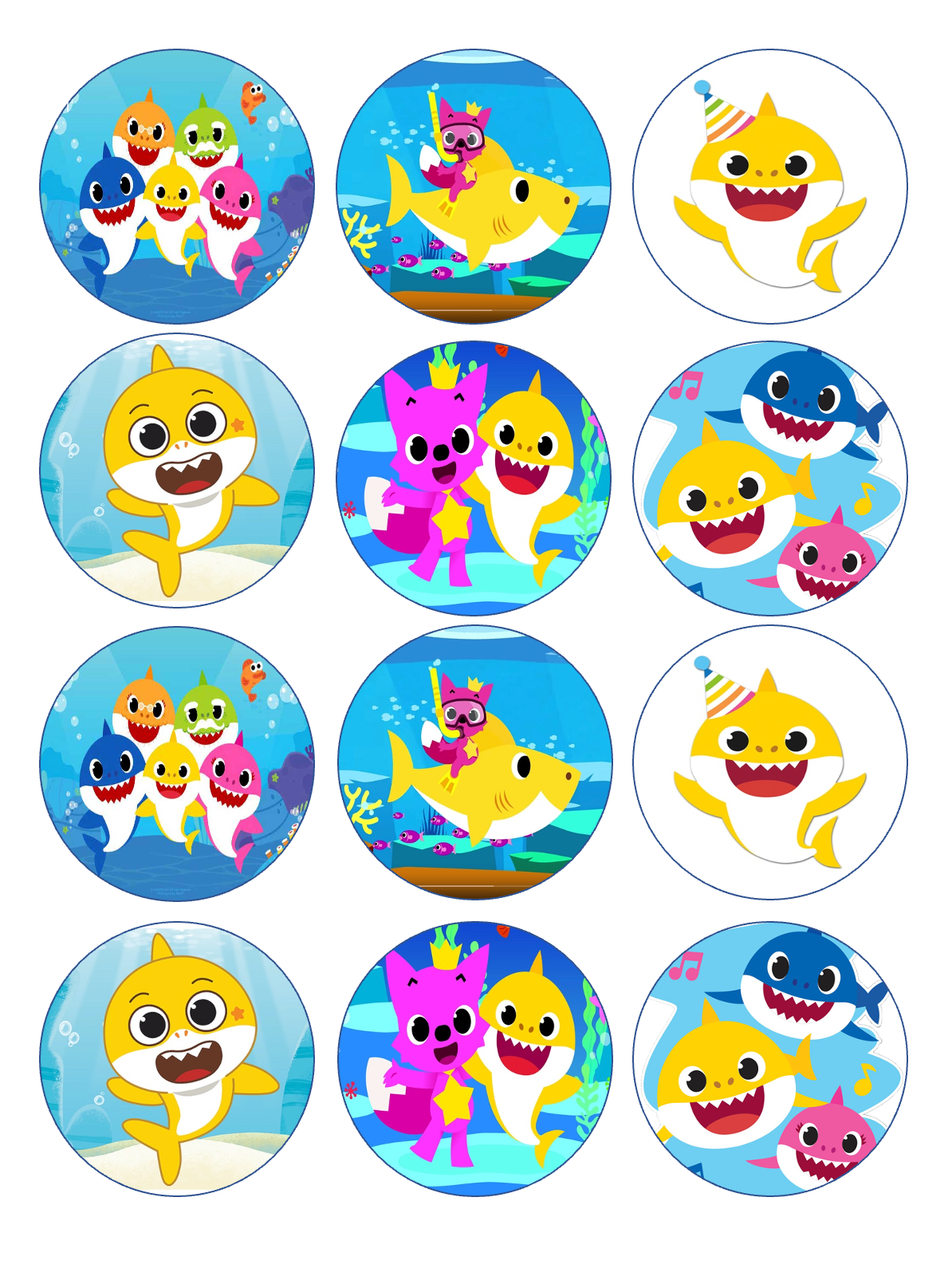 Set of 12 "Baby Shark" pre cut edible image discs for desserts, drink toppers, choose your size