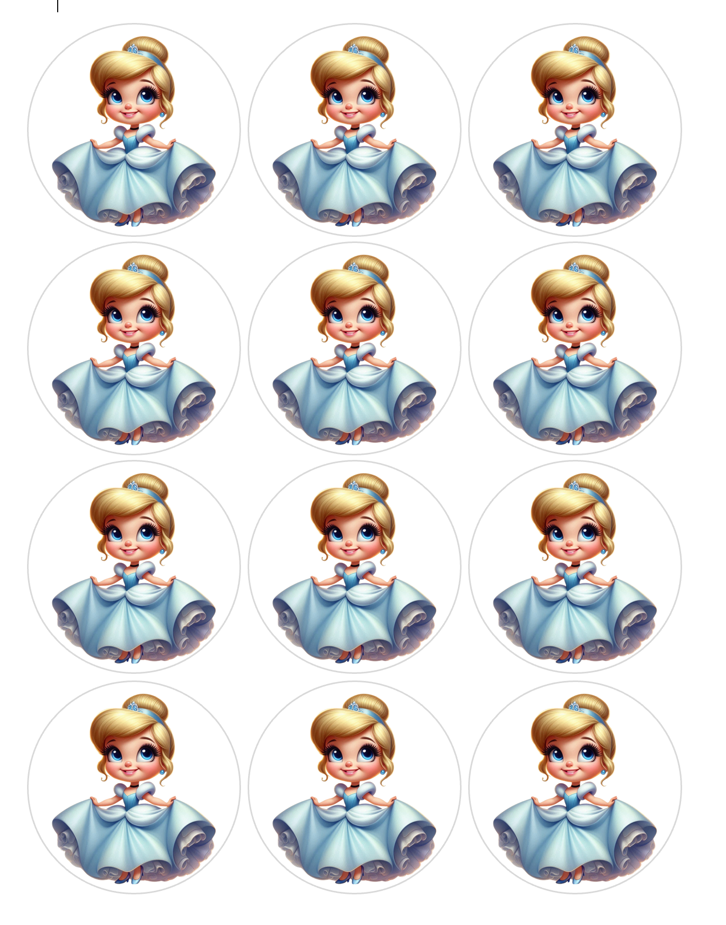 Set of 12 Cinderella pre cut edible image discs for desserts, choose your size