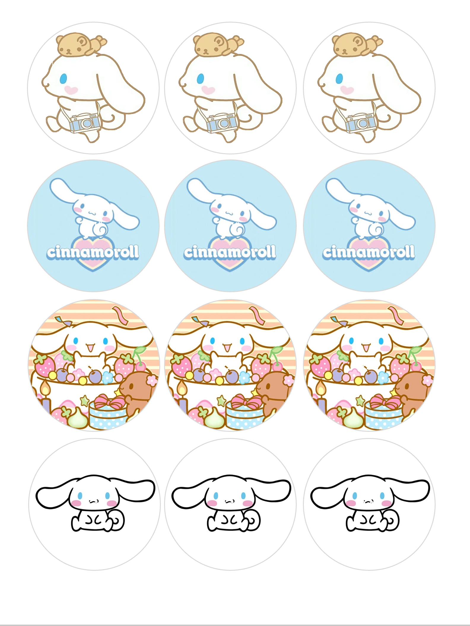 Set of 12 "Cinnamoroll" pre cut edible image discs for desserts, drink toppers, choose your size