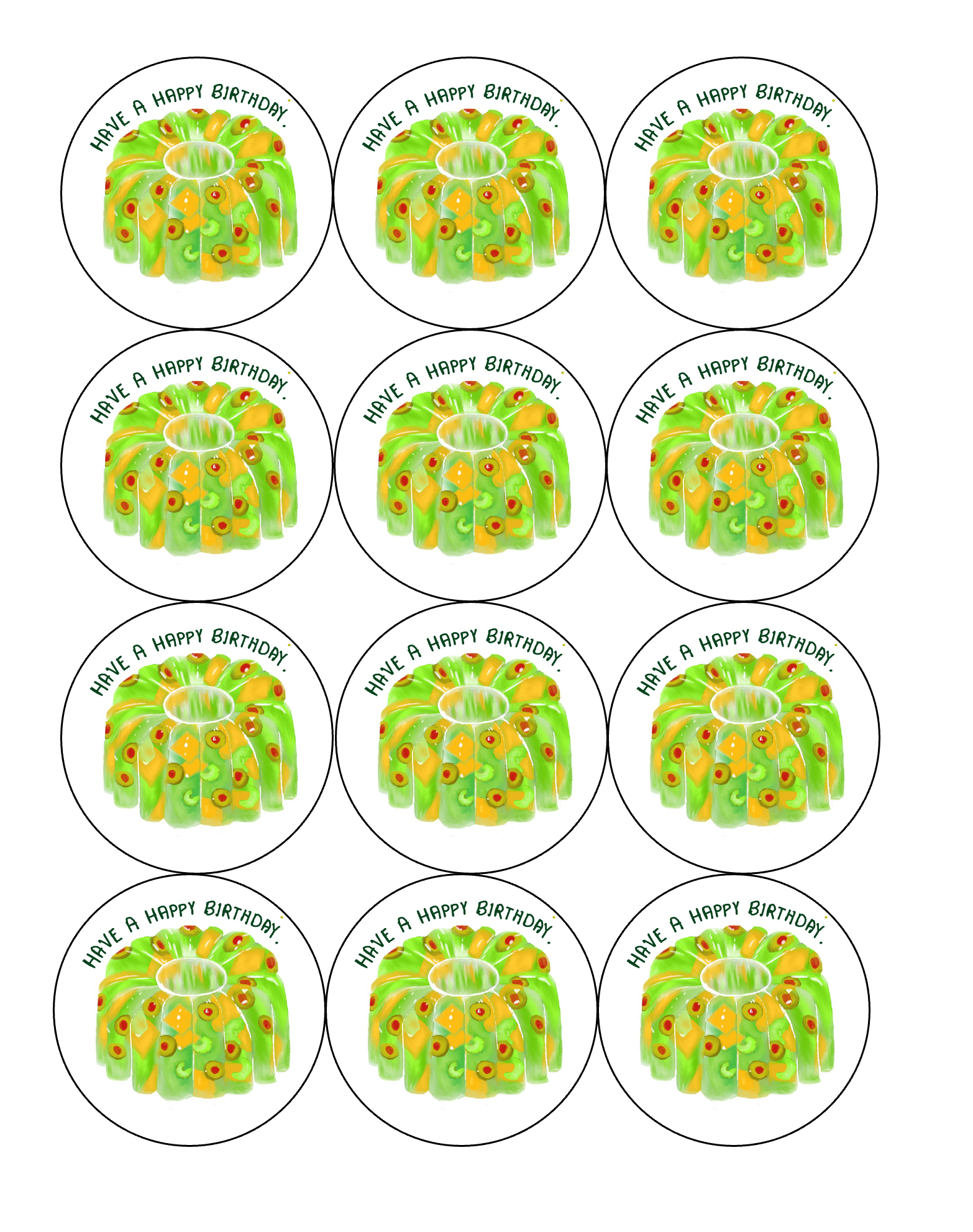 You are buying a set of 12- "Have a Happy Birthday" retro jello dessert themed edible image discs