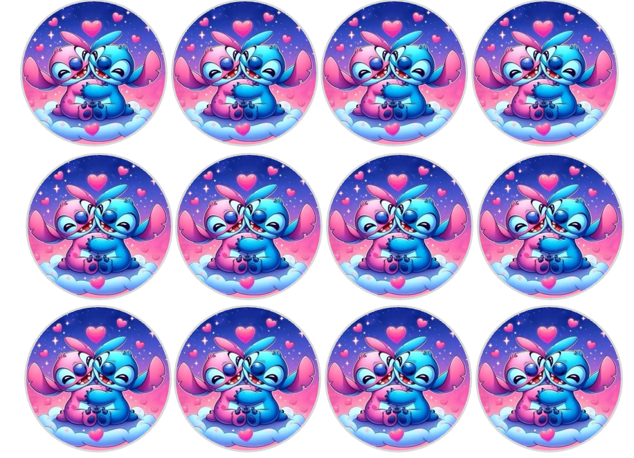 Set of 12 "Lilo and Stitch" pre cut edible image discs for desserts, drink toppers, choose your size