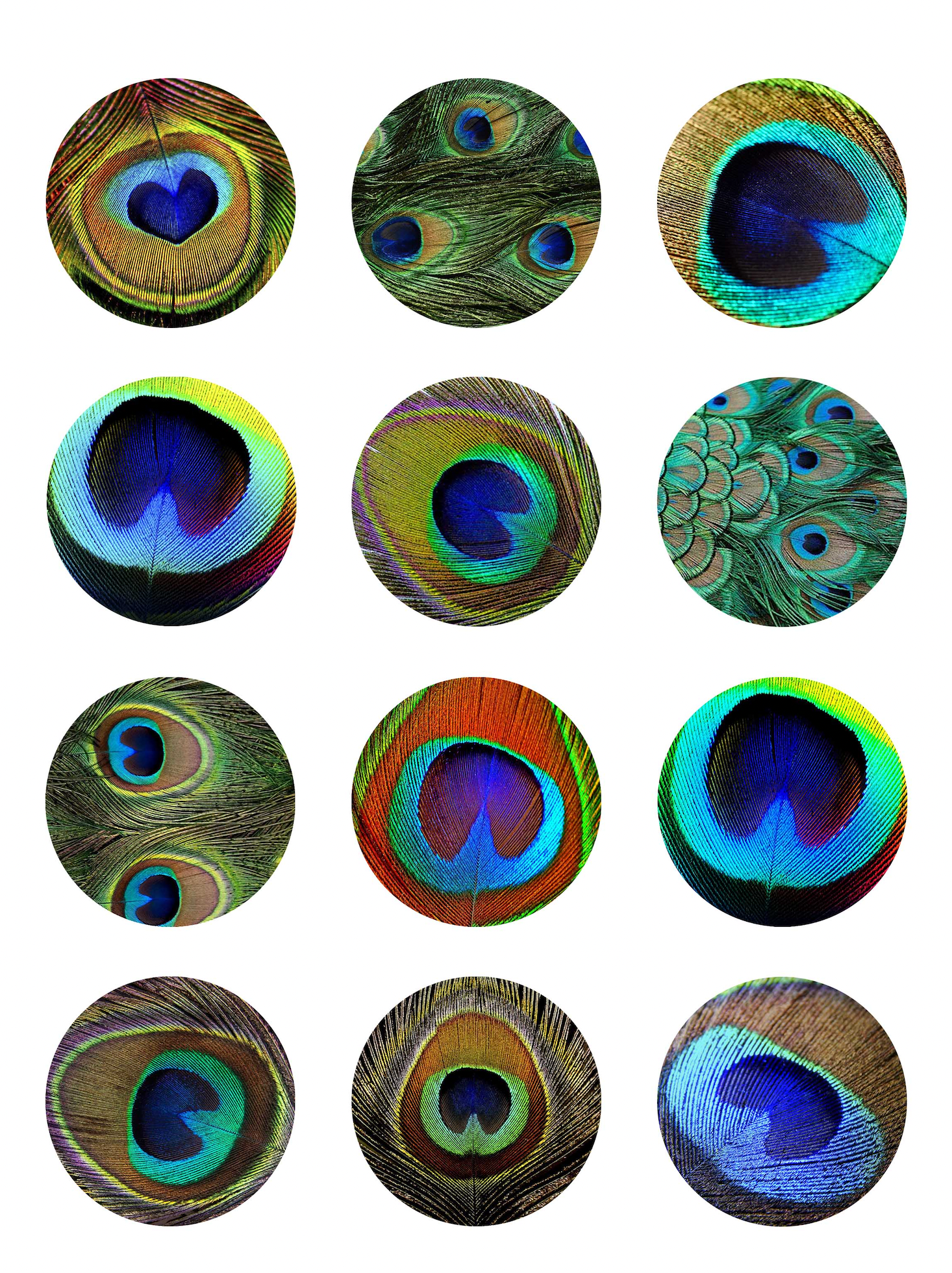 Set of 12 "Peacock Feather" pre cut edible image discs for desserts, drink toppers, choose your size