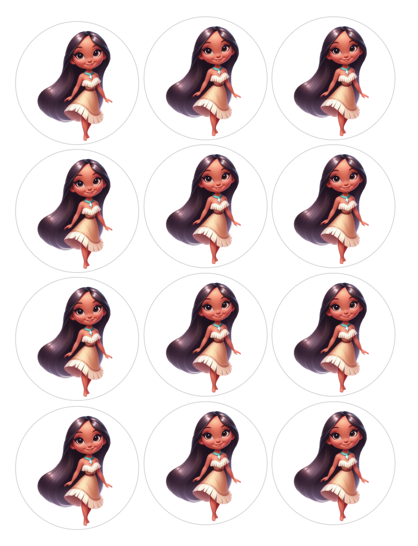 Set of 12 Pocahontas, pre cut edible image discs for desserts, choose your size