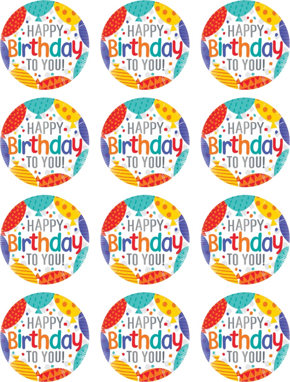 Set of 12 "Happy Birthday" pre cut edible image rounds for desserts, drink toppers, choose your size