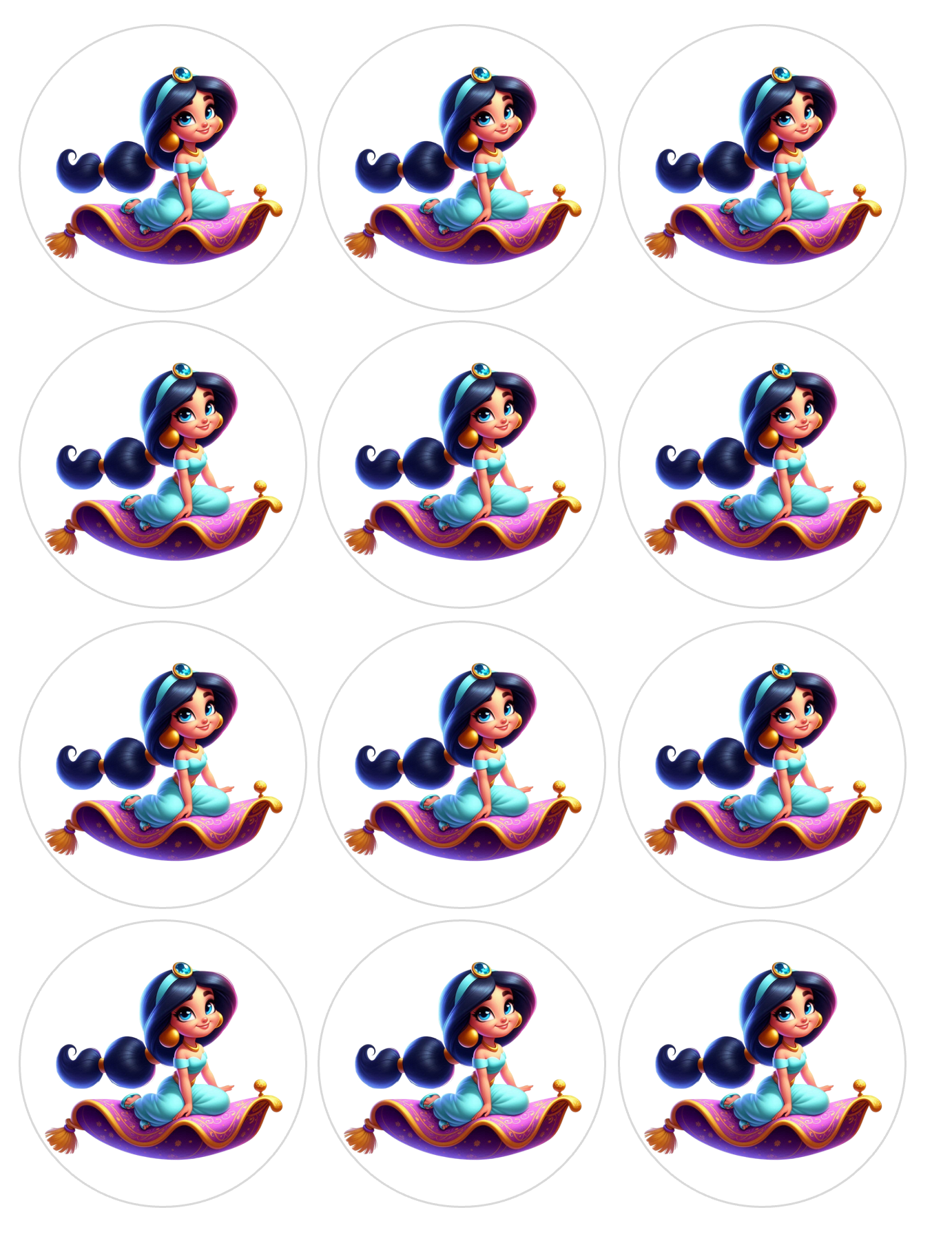 Set of 12 Princess Jasmine, pre cut edible image discs for desserts, choose your size