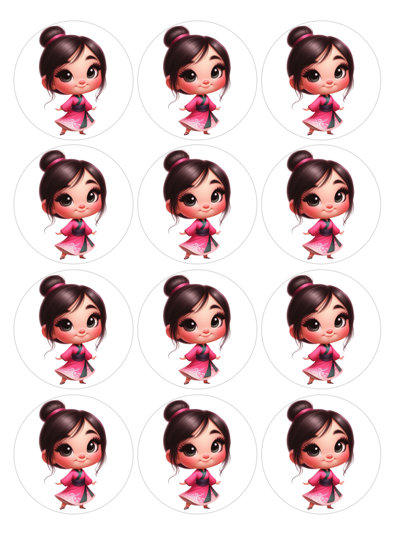 Set of 12 Princess Mulan, pre cut edible image discs for desserts, choose your size