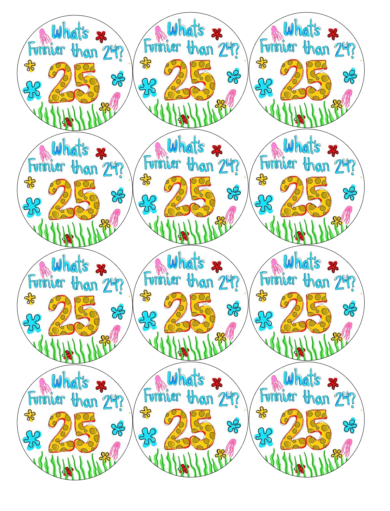 Set of 12 "What's Funnier than 24? 25th birthday" Spongebob pre cut edible image discs for desserts, drink toppers, choose your size