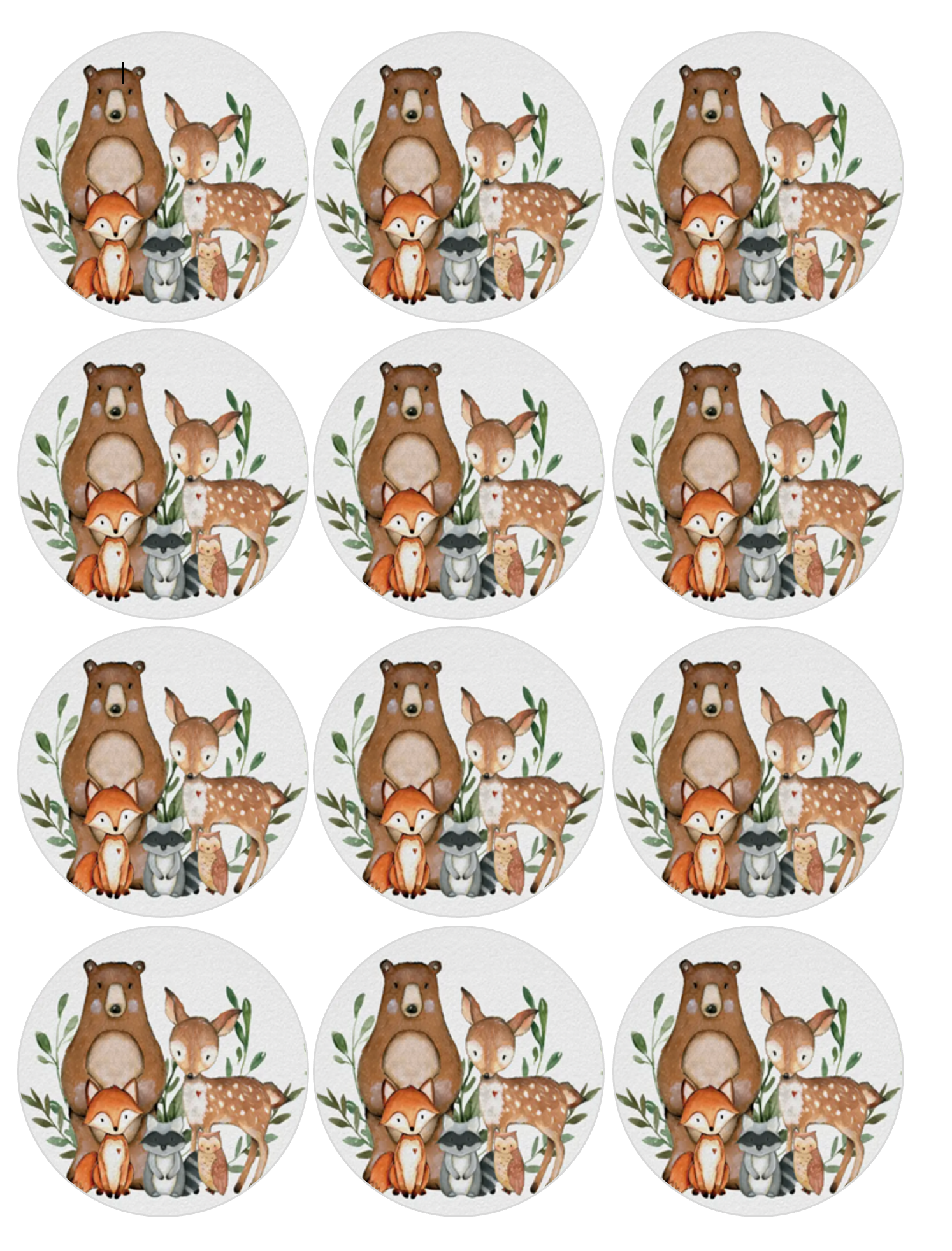 Set of 12 "Woodland Animals" pre cut edible image discs for desserts, drink toppers, choose your size