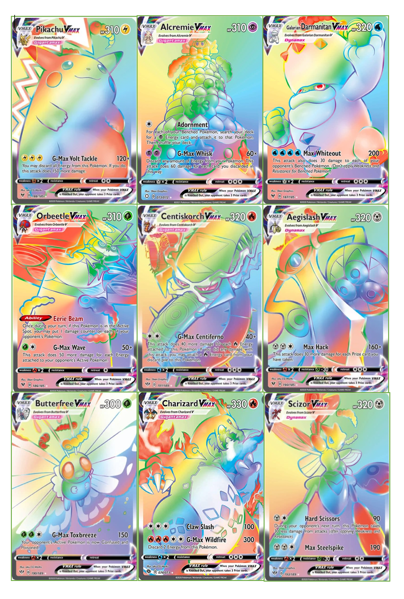 Set of 9 edible images for desserts, pre cut, 2x3" or 2.5x3.5" rectangles- rainbow VMAX pokemon cards